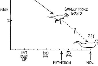 Suponemos que recordáis alguna de las tiras de XKCD creadas por Randall Munroe en las que hay referencias paleontológicas (puedes echarles un ojo aquí). Recientemente, ha publicado una nueva entrega en la que imagina cómo podría haber sido la evolución de las extremidades del tiranosaurio si no se hubiese extinguido a finales del Cretácico...