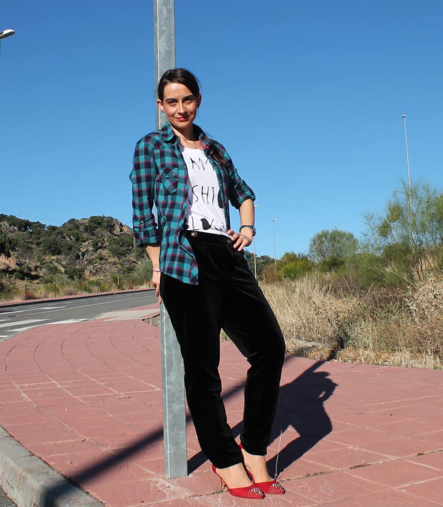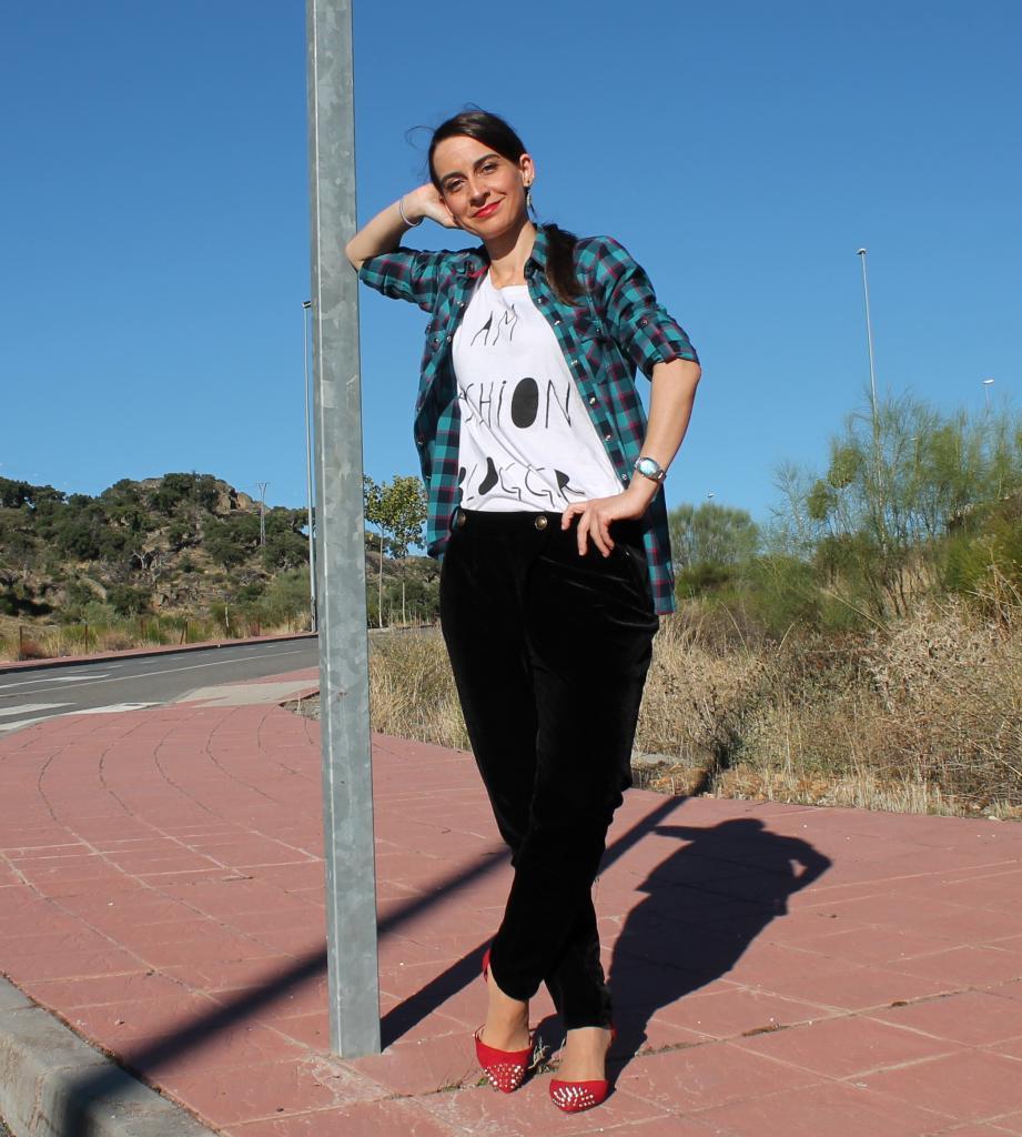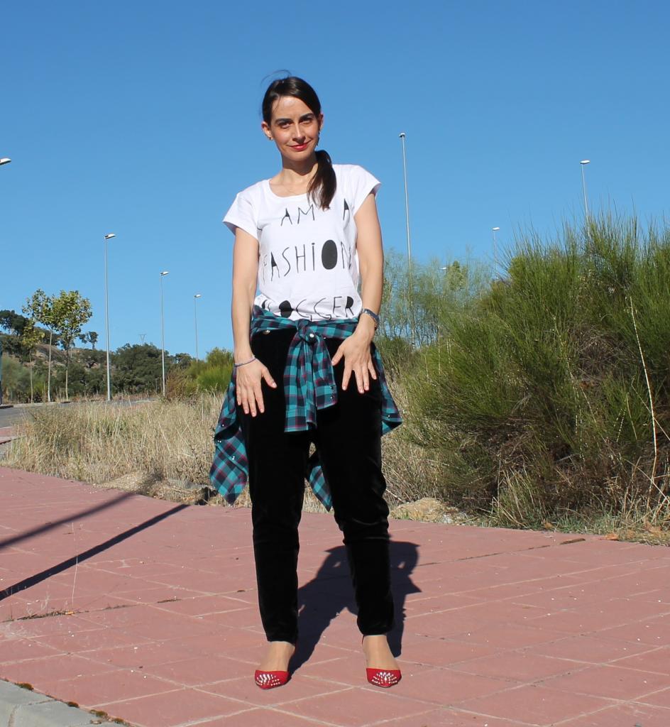 T-shirt- Primark ( a friend´s present).Shirt- Stradivarius (old).Trousers- Mango (old).Shoes- Zara (old).Necklace- Adamarina alhajas.En el look de hoy os quiero enseñaros una camiseta super chula con el mensaje " I am a fashion blogger" que me ha regalado una compañera de trabajo, Victoria. Victoria es profe de inglés como yo y una gran fan del mundo blogger .En cuanto la hablé de mi blog personal el año pasado en la comida de principio de curso, se hizo seguidora; también ella tiene un blog precioso con los niños de su clase. Pichad aquí y os llevará directos a él.Muchas gracias por el regalo, compi! me hizo mucha ilusión.
