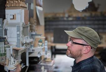 El artista de Lawrence, Kris Kuksi, trabaja en una pieza en su estudio de North Lawrence. Kris Kuksi , uno de los escultores más distinguidos que viven en la actualidad y uno de los artistas líderes en el campo del realismo fantástico, Kris Kuksi utiliza el ensamblaje para hacer esculturas ricas y muy detalladas que comentan la historia, la vida, la muerte, el conflicto espiritual y los recuerdos fugaces de la infancia. Crea sus piezas escultóricas espeluznantes y asombrosas a partir de objetos encontrados o elementos como juguetes pequeños y componentes mecánicos. Entre los ensamblajes escultóricos, Kuksi también es un pintor consumado cuyas piezas ricas y salvajemente impredecibles se han exhibido en numerosas muestras individuales y colectivas en los Estados Unidos y más allá.