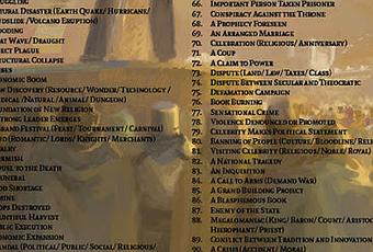Son dos tablas para usar 1d100: 1d100 Political Events es para generar (O elegir directamente por parte de DM) eventos de tipo político-social que están pasando en el entorno de la partida y que pueden afectarla,generando nuevos ganchos,situaciones, etc. Quizás una carestía súbita de los alimentos puede iniciar motines y disturbios y los PJs son en encargados de investigarlos o igual se ven envueltos en una conjura palaciega,...
