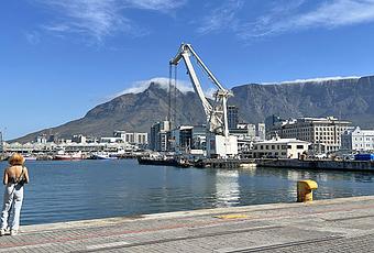 En Victoria & Alfred Waterfront, la zona de ocio en torno a los muelles del puerte, también hay buenos lugares para admirar Table Mountain. Casi todos los turistas buscan la estructura amarilla con el nombre que enmarca la montaña, justo al lado del restaurante español La Parada.