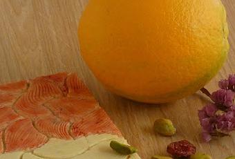 Machacamos un poco los pistachos. Picamos muy fino los arándanos. Mezclamos los pistachos, arándanos y la ralladura de naranja.