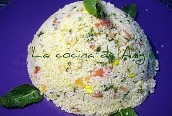 - Remojar 150 grs. de cuscús (para 2-3 personas), con la misma cantidad de agua fría con sal, y dejar que se vaya absorbiendo. Cuando el grano se hinche y no tenga líquido, remover con un tenedor para separarlo y esponjarlo.