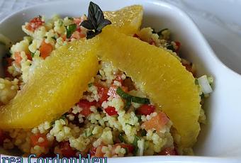 Se pela la manzana y se trocea en dados homogéneos. Se guarda en agua acidulada. Se pela la naranja y se sacan los gajos. Se corta en brounoise el pepino, la cebolleta y el pimiento.Se saca el zumo de 1 limón, se vierte en el cous cous y se añade la fruta, el pimiento, el pepino y la cebolleta. Se mezcla bien.Se corta la hierbabuena y el perejil en trozos y se añade al tabulé.Se aliña con aceite y sal al gusto.