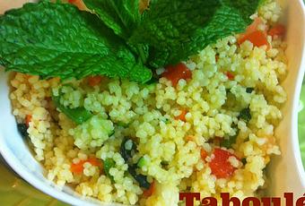 El tabuleh o taboulé es una aromática ensalada libanesa elaborada con cuscús. El cous-cous o antiguamente "alcuzcuz" es un plato tradicional de Marruecos hecho a base de sémola de trigo.