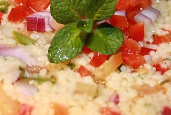 100 gr de couscous.zumo de 1 limón.1 tomate de ensalada.1/3 parte de un pimiento rojo grande.1 pimiento verde italiano o la tercera parte de uno verde grande.1 cebolla pequeña.sal, pimienta.aceite de oliva.Perejil y hojas de menta o hierbabuena.