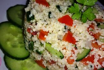 Dejamos enfriar a temperatura ambiente y removiendo de vez en cuando. Vamos mientras lavando los tomates, quitando las pepitas y cortándolo en trocitos pequeños. Lavamos el pepino y también cortamos en trocitos pequeños (yo corté unas laminas finas de pepino para decorar). Picamos la cebolla, picamos la menta, el perejil y el cilantro fresco (mas o menos una cucharadita por cada uno). En un bol ponemos todos los ingredientes y añadimos el zumo de un limón, un poquito de sal y un poquito de pimienta negra molida. Mezclamos todo bien y reservamos en la nevera hasta la hora de comer. Emplatamos y listo para comer...
