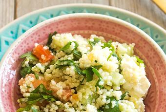 Mientras, pelamos y cortamos en dados el pepino y los tomates. Cortamos también en daditos la cebolleta. Lo mezclamos todo con el cuscús. Añadimos el queso feta desmenuzado. Rallamos las limas por encima y lo regamos con su zumo y el zumo de limón. Sazonamos al gusto y agregamos un buen chorro de aceite de oliva. Picamos las hierbas y las añadimos. Sobretodo tiene que tener mucho perejil. Mezclamos todo bien y enfriamos al menos durante una hora. También está muy rico de un día para otro ya que los sabores son más pronunciados.