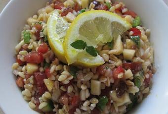 - Trigo 125 g.- Tomates prietos y rojos 3.- Cebolleta ½.- Pimiento verde ½.- Manzana 1.- Pasas sin hueso, un puñadito.- Pepino ½ (opcional, yo no le puse).- Almendras fritas sin piel (opcional).- Hierbabuena (varias hojas).- Zumo de limón (al gusto).- Aceite de oliva 6 cdas.- Pimienta negra molida.- Sal.