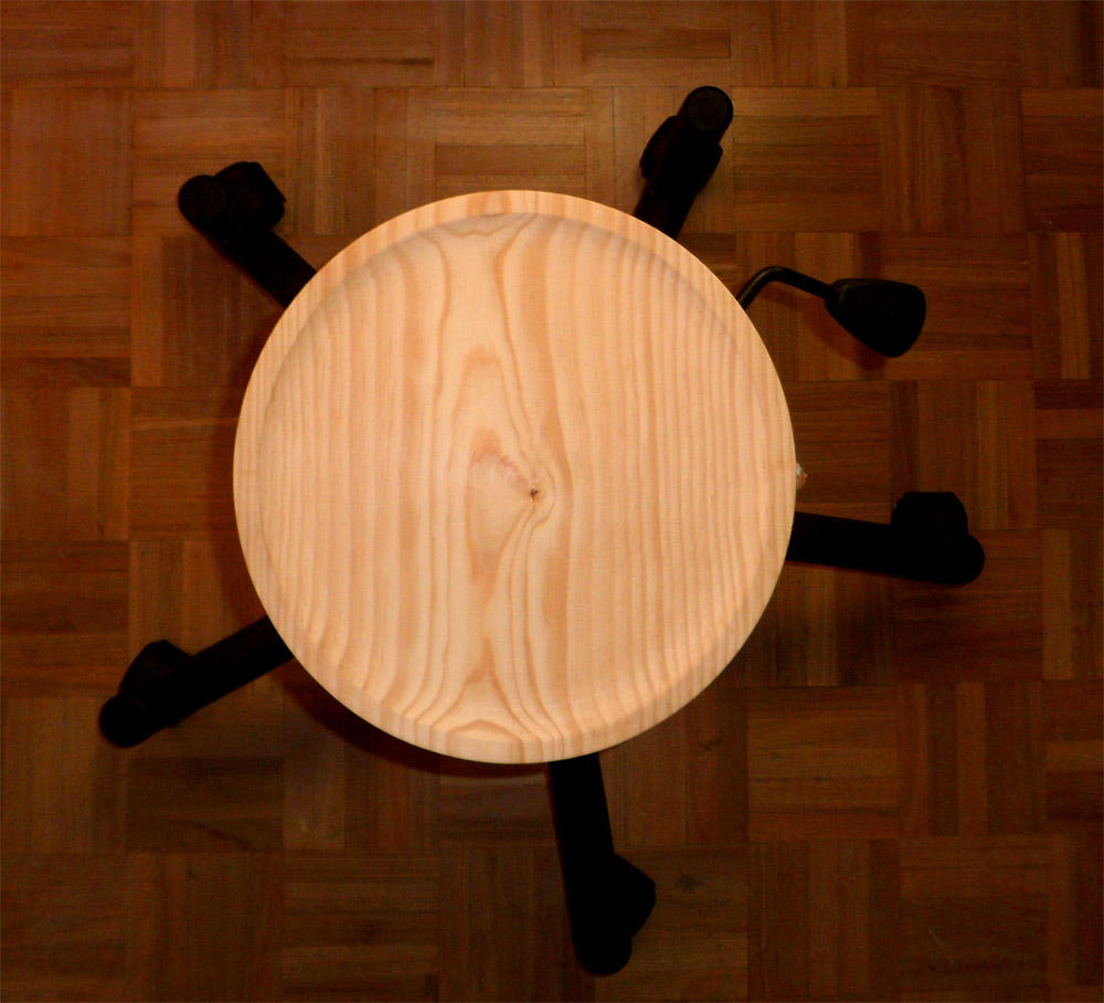 Materiales y herramientas:- Tabla de quesos (podéis usar cualquier tabla similar:tabla de pizza, tabla para cortar,..).- Cojín (de la misma medida que la tabla).- Base silla de oficina.- Destornillador.- Adhesivo de montaje (Pattex No más clavos).Procedimiento:Primero, hemos desmontado de la silla el respaldo y el asiento.