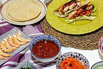 Para realizar los tacos me informé que en México las tortillas siempre son de maíz y se usan ingredientes frescos y en crudo para acompañar las carnes o mariscos del relleno, usando mucho el cilantro, el tomate y la cebolla y siempre acompañados de una salsa de chile, la salsa guajillo no tiene pérdida, hay muchas recetas en Internet.