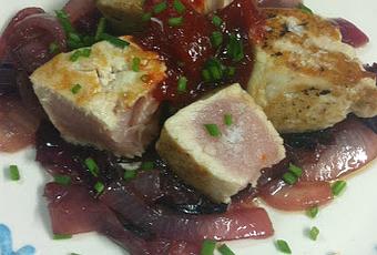Se emplata poniendo un lecho de cebolla, el atún en tacos por encima, se espolvorea con sal en escamas y cebollino picado y se remata con una cucharadita de mermelada de pimientos asados.