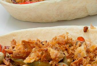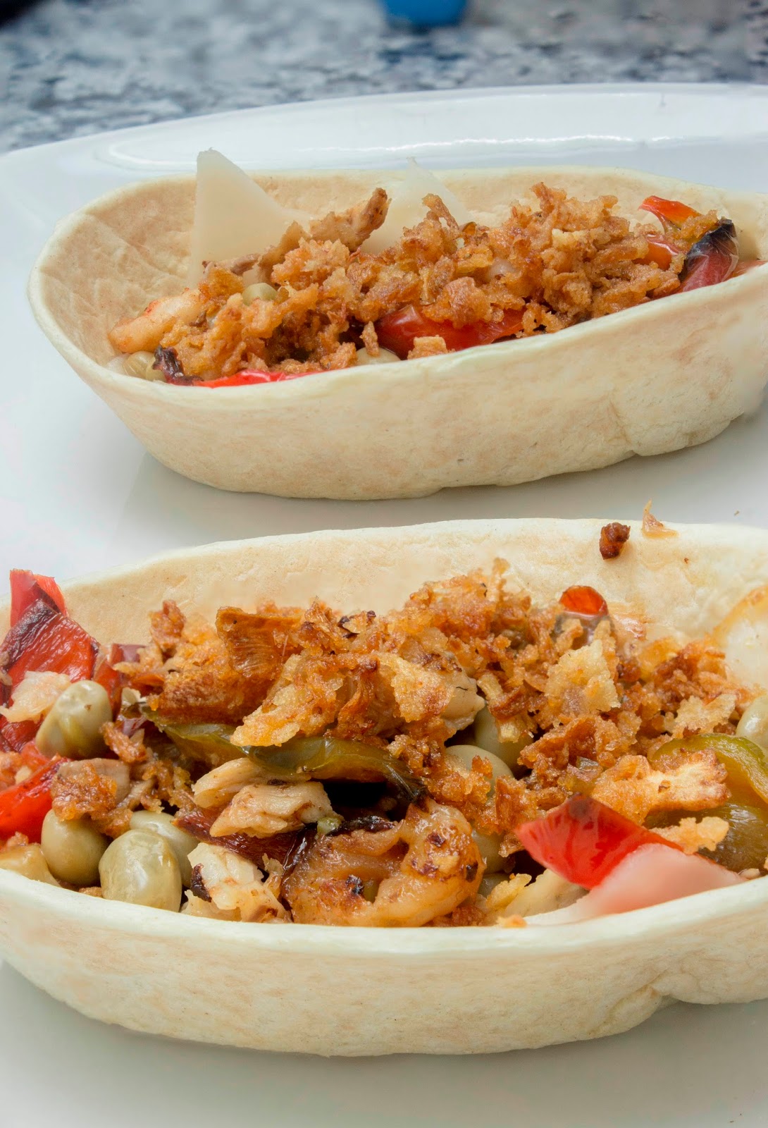 4 pimientos rojos pequeños1 tarro de habitas baby3 filetes de doradaun puñado de gambitas4 tacos2 lonchas de quesocebolla frita