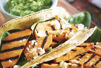 3. Calienta las tortillas. Coloca sobre ellas la espinaca, un poco de camote asado, quinoa y queso de cabra. Sirve.