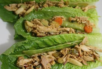 Esta receta me encanta porque puede servirse como plato principal o incluso como entrante. Para una reunión es ideal pues no requiere cubiertos y además, es un plato flexible pues puede sustituirse el pollo por salmón o atún, o incluso convertirse en un platillo vegetariano simplemente sustituyendo el pollo por tiras o cuadros de tofu o soya texturizada.