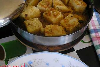 está aquí publicado en el blog. Pero el otro día en el fútbol hablando de lo que mas me gusta que es la cocina con una de las otras madres, sobre como aprovechar restos me dijo que ella cuando le sobra tortilla la corta en tacos y la guisa o bien aprovecha salsa de guisar carne que le haya sobrado. Yo el otro día hice una tortilla y creo que me pasé pelando patatas, me salio no mas grande, porque la sartén es la misma, pero si mas gorda y en el plato también eso se notaba. Eso quiere decir que me sobró tortilla y al día siguiente a mi no me gusta recalentada. Recordé entonces lo que me había dicho Bea e hice una salsa y guise la tortilla que me había sobrado. Otra rica forma de comerla y aprovechar las sobras.