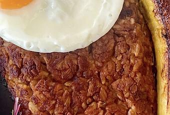 7. Una vez bien dorada toda la parte exterior, servimos en un plato, un chorrito extra de aceite de oliva por encima le viene de lujo, ahora, coronamos con un huevo frito y acompañamos con plátanos bellacos fritos y sarsa de cebolla.