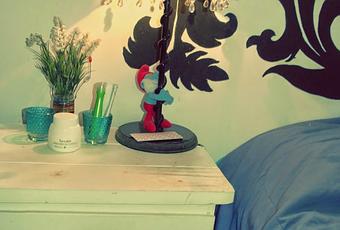 Sobe la pantalla del velador tengo la corona de flores del casamiento de una de mis amigas, que me encanta y no se porque me gusta todavía mas sobre el velador.