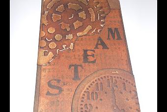 Aprovechando los elementos comunes del steampunk quise realizar un trabajo orientado al genero masculino, que muchas veces nos parece un verdadero desafio realizar algo hecho a manos para ellos y que sea de su agrado. Por ello utilicé para el fondo del trabajo un sello de caracteres y letras de maquina de escribir y un fondo marrón (utilicé la tinta distress "Vintage photo"), luego encima fui decorando con cartulinas con relieve. El relieve lo hice con las placas de embossing de Tim Holzt "Alterations" inspiradas en steampunk, que viene una placa de engranajes y otra de relojes.