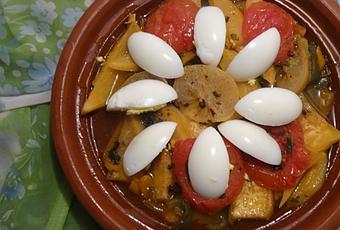 حبة بيض مسلوقطريقة التحضير:1. في طاجين، تصب زيت الزيتون، ويضاف البصل مقطع والكزبرة أو البقدونس مفرومين.وقليل من الملح والفلفل، والزنجبيل المطحون والكركم والفلفل الحلو. يطهى الكل على نار متوسطة الحرارة لمدة 3-4 دقائق.2. تغسل وتقطع الخضروات الاخرى و تضاف إلى البصل. ترش بقليل من الفلفل الاسود. يغطى الطاجين و يترك يطهى على نار هادئة . يزال الطاجين من فوق النار و يضاف البيض المسلوق مقطع الى اجزاء.