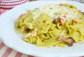 La auténtica carbonara no lleva nata, la salsa se hace a base de huevos batidos y servidos al punto para que no se cocinen demasiado. Últimamente la lactosa me sienta regular, y me encanta poder comer un plato así de delicioso dejando atrás la leche o la nata.