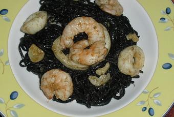 TAGLIATELLE AL NERO DI SEPIA CON CALAMARES Y GAMBAS