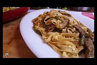 Tagliatelle con ternera y soja, ingredientes:1 paquete de tagliatelle.4 filetes de ternera, 1 pimiento verde.1/2 cebolla, salsa de soja, 1 hoja de laurel.Aceite de oliva virgen, harina.Pimienta negra recién molida.