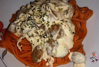 Ponemos una sarten al fuego con un chorrito de aceite de oliva y sofreimos la cebolla cortada en juliana. Cuando esté pochadita añadimos los champiñones enteros y laminados bien escurridos y dejamos que se doren un poco. Añadimos la nata,un poquito de sal,removemos un poco y cuando empiece a hervir apagamos el fuego. Yo puse la pasta en un plato y encima la salsa con un poco de orégano espolvoreado.
