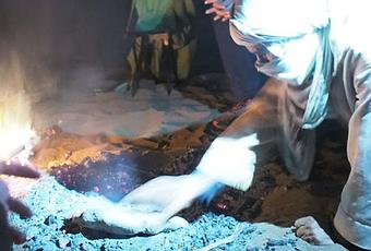 Durante nuestro treking por el desierto del Sahara acampamos una noche en dunas de Erg Lahnithie (Marruecos). Ese día vimos el proceso de elaboración del Tagoula, un pan bereber cocido bajo la arena del desierto. Es un placer comer pan cada día, cocido bajo las cenizas enterradas en la arena según una antigua receta. El resultado es un pan plano, casi sin miga, y de corteza dura.