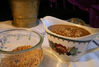 El tahine es una deliciosa crema que se elabora moliendo las semillas de sésamo tostadas -también llamado ajonjolí- y mezclándolas con aceite y un poco de agua hasta conseguir una emulsión. Esta crema es típica de la gastronomía de Medio Oriente y de otros muchos países mediterráneos, donde forma parte indiscutible de diversos platos, aunque puede degustarse por sí sola como aperitivo, al extenderla sobre galletas, pan de pita o pan tostado, como alternativa a la mantequilla. Su sabor es pronunciado y se asemeja al de los frutos secos.