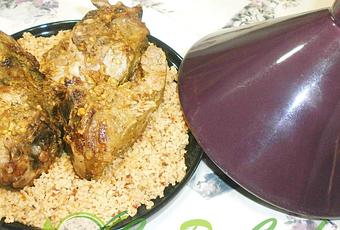 Cuando el cordero este asado colocar en el tajín sobre el cuscus y regar con la salsa que se ha formado.