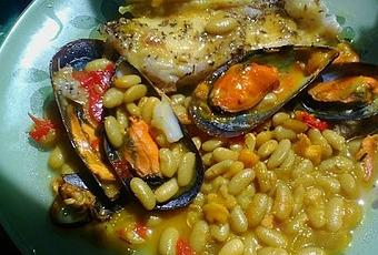 - luego agregamos el vaso de vino blanco, el perejil picado, los mejillones y los 200 gr de verdinas .. con todo el jugo de cocerlas ....