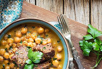 Cubrir con agua y dejar cocer a fuego bajo con la cazuela tapada sobre una hora y media, hasta que la carne esté tierna. Añadir los garbanzos y cocer diez minutos más.