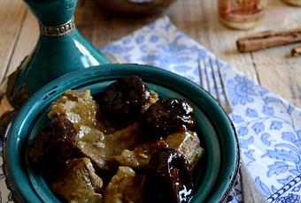 ½ Pierna de cordero cortada en trozos.1 Cebolla.1 Cucharadita de jengibre en polvo.½ Cucharadita de pimienta blanca.1 Cucharada colmada de cúrcuma.1 Palo de canela partido en tres trozos.1 Cucharadita de sal.Unas hebras de azafrán.50 gr. de mantequilla.2 Cucharadas de aceite.10 o 12 ciruelas pasas sin hueso.50 gr. de azúcar.