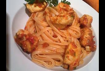 Ingredientes: para 4 personas4 cucharadas de aceite de oliva virgen extra2 pechugas de pollo1 cebolla1 pimiento italiano/o rojo2 tomates maduros grandessal de Himalaya con azafranpimienta negra molidapimenton de Murcia2 dados de Knorr de verduras50 ml de tomate fritto125x4 gr de tallarines ( se dice que la racion de pasta para una persona es de 125 gr)agua perejil para decorar