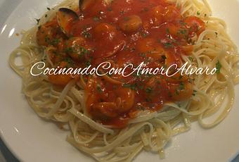 - Servimos los tallarines que teníamos reservados, los ponemos en un plato, y encima echamos la salsa de gambas y almejas.