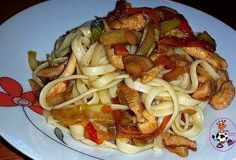 Troceamos la pechuga de pollo en tiritas y reservamos. En una sarten ponemos un chorrito de aceite de oliva, sofreímos la cebolla, el pimiento picadito en juliana y el calabacino en tiritas finas. Cuando esté todo pochadito añadimos la pechuga de pollo, un chorrito de salsa de soja ,mezclamos bien, bajamos el fuego y dejamos unos 5min al fuego.
