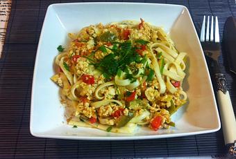 Se cuecen los tallarines según instrucciones del fabricante. Se escurren y se vuelcan sobre el pollo con verduras.
