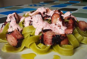 PasosNo creo que os vayáis a complicar la existencia con esta receta. Cómo podréis imaginaros la pasa hay que cocerla con agua y un poco de sal. A mí me gusta al dente, pero cocedla cuánto queráis.Mientras se cuecen los tallarines vamos a hacer la salsa. Lavad bien dos rábanos medianos y trituradlos con la batidora hasta que tengáis una papilla. Añadid un poco de sal, pimienta y aceite de oliva para darle otra pasada con la batidora. Ahora añadid una cucharada sopera de mayonesa y mezcladla con la cuchara, si lo queréis mezclar todo en la batidora sois libres de hacerlo, pero la salsa se queda bastante líquida.Ahora sólo os queda trocear un poco el pulpo y mezclarlo con la salsa y los tallarines. Mientras estaba comiéndome esta delicia se me ocurrió ponerle un poco de piña troceada a ver cómo le quedaba y a mí me gustó bastante. No hay foto porque la fotografía no hubiera sido nada decente.