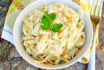 Ingredientes para 3 personas: 200 gr., de tallarines Udon1 c/s de mantequilla 2 yemas de huevo 150-200cc. de leche evaporada3 c/s de queso parmesano rallado50 gr. de almendras fileteadas tostadas.Sal, pimienta negra En una cazuela poner agua a hervir, añadir sal y la pasta. Seguir las instrucciones del fabricante en lo que respecta al tiempo de cocción. Colar y guardar un poco del agua de cocción.