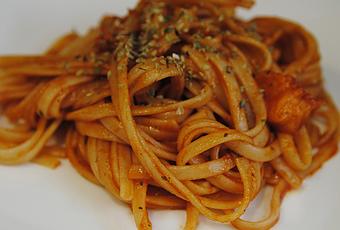 Añade la salsa de tomate a los tallarines y remueve, o si lo prefieres emplátalo colocando una ración de tallarines y añadiendo 2 o 3 cucharas de la salsa de tomate por encima.