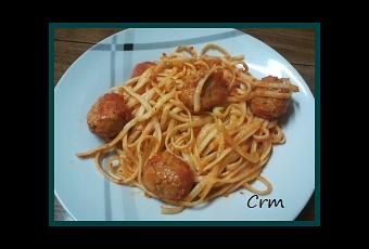 -Salsa de tomate casera (RECETA)-Tallarines al dente (RECETA)-300 gr de seitán-1 cebolla-1 diente de ajo-1 rebanada de pan de molde remojada en bebida vegetal-Perejil -Sal-Pimienta blanca-Aceite de oliva virgen-Harina de garbanzos