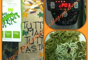 Poner los tallarines en la cubeta de la GM E, añadir sal y agua hasta cubrir la pasta un dedo por encima, tapar con válvula cerrada, menú turbo, cuando termine despresurizar manualmente, escurrir y reservar, ahora poner aceite en la cubeta, añadir los ajos laminados y la cayena, dorar un poco en menú plancha, cuando estén doraditos añadir las gulas dar unas vueltas y añadírselo a los tallarines.