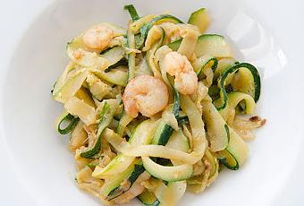 Añadir las gambas, removiendo todo el rato para que cojan el sabor del ajo y la cayena. Una vez que las gambas tengan color, echar los tallarines de calabacín, y remover todo bien hasta que los tallarines estén blanditos.