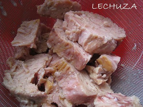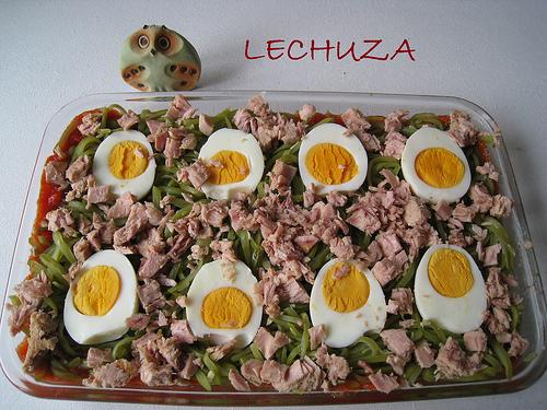 Repartimos el atún bien escurrido del aceite de la conserva y los huevos cocidos cortados por la mitad.