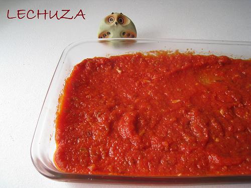 En una fuente resistente al horno, ponemos como base la salsa de tomate. Yo utilicé una salsa casera, pero podéis ponerle un tomate frito.