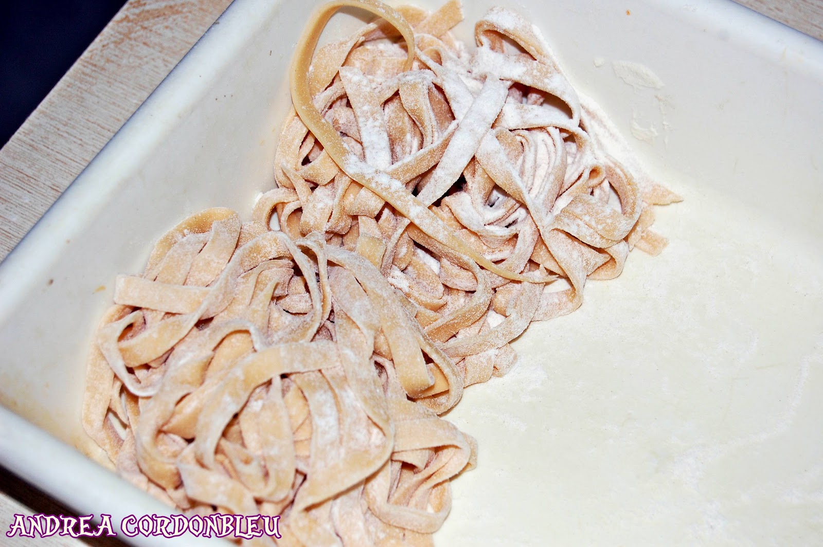Se cortan trozos de masa (para facilitar el proceso) y se van haciendo láminas muy finas que se irán cortando con una maquina especial que se puede adquirir en tiendas especializadas ( lo corta en tallarines o tallarín fino). Si no se tiene laminadora, se estirará con ayuda de un rodillo y se cortará con un cuchillo. Es mucho más laborioso, si cabe, pero se puede hacer sin problema.También se pueden cortar de otras formas para hacer raviolis o tortellinis (cuadrada) o dejarlo en láminas más grandes para hacer canelones o lasaña. Si se quiere hacer pasta fresca rellena, no tenemos más que preparar el relleno, poner un poco en la pasta y cubrirlo como queramos.Se prepara un recipiente con abundante agua hirviendo, una pizca de sal y orégano. Se va cociendo la pasta poco a poco para que no se apelmace. Una vez esté en su punto se saca del agua y se escurre bien.Para los tallarines, mi abuela tenía un pisto exquisito. Fue lo que le pusimos como salsa. También se puede elaborar una salsa boloñesa, carbonara…Para la boloñesa, se saltea un poco de cebolla y pimiento bien picado. Se añade carne picada y se termina de hacer. Se añade por ultimo tomate frito. Para la carbonara, se saltea cebolla y un poquito de beicon. Se añade nata, se deja reducir un poco y se sirve acompañando a la pasta.
