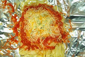 Ahora llega la hora de montar nuestro papillote, cogemos un trozo de papel albal y le ponemos un poco de tomate, le echamos los tallarines por encina, más tomate, queso rallado al gusto, un chorrito de aceite y orégano. Lo cerramos y lo metemos al horno, que habremos precalentado a 150º, durante 20 minutos o hasta que veamos que se han inflado los paquetes. Abrimos los paquetes con mucho cuidado para no quemarnos y ya está listo nuestro plato para comer.