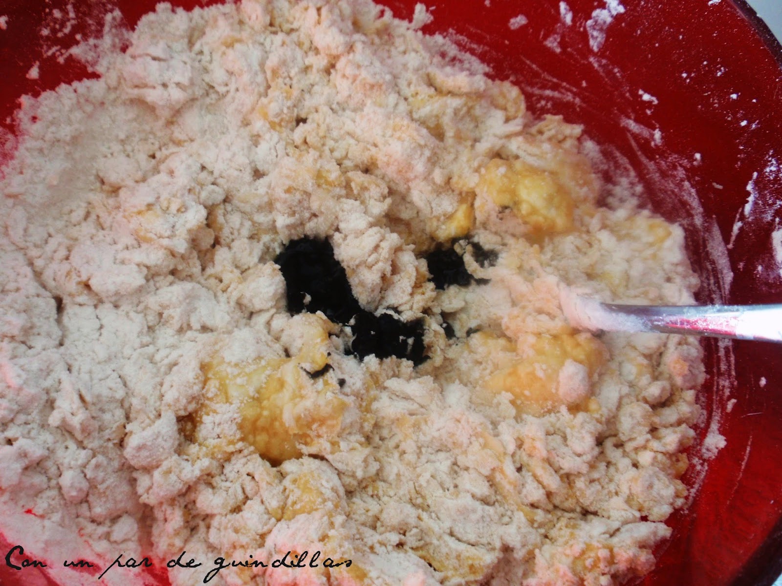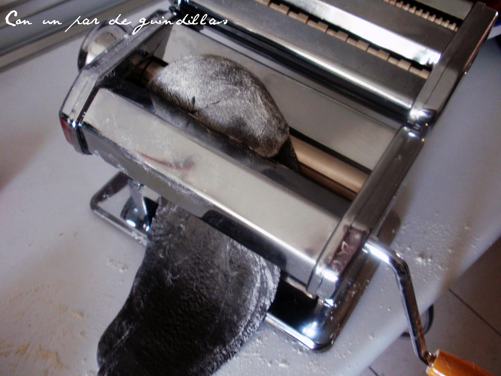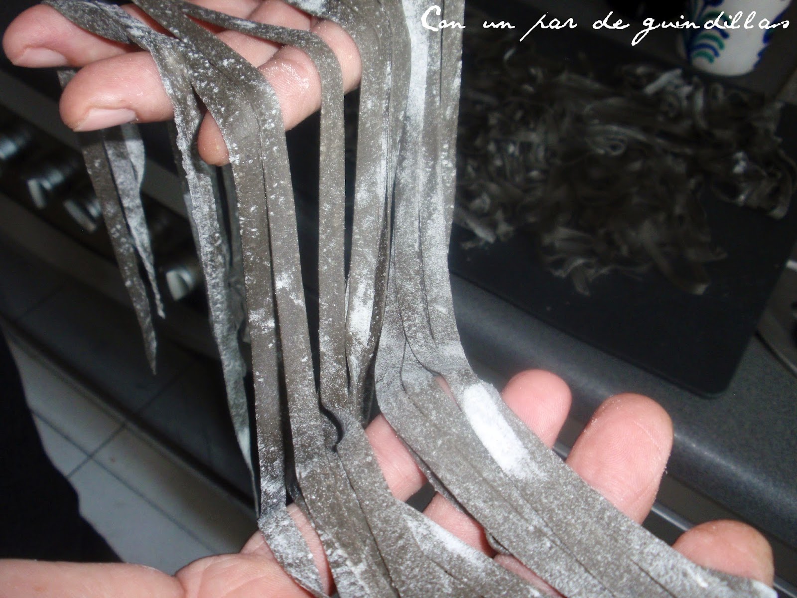 1.- Se hace la masa básica, añadiendo un sobre de tinta de calamar (diluido en una cucharada sopera de agua) justo cuando los huevos están integrados y empezamos a amasar con las manos.