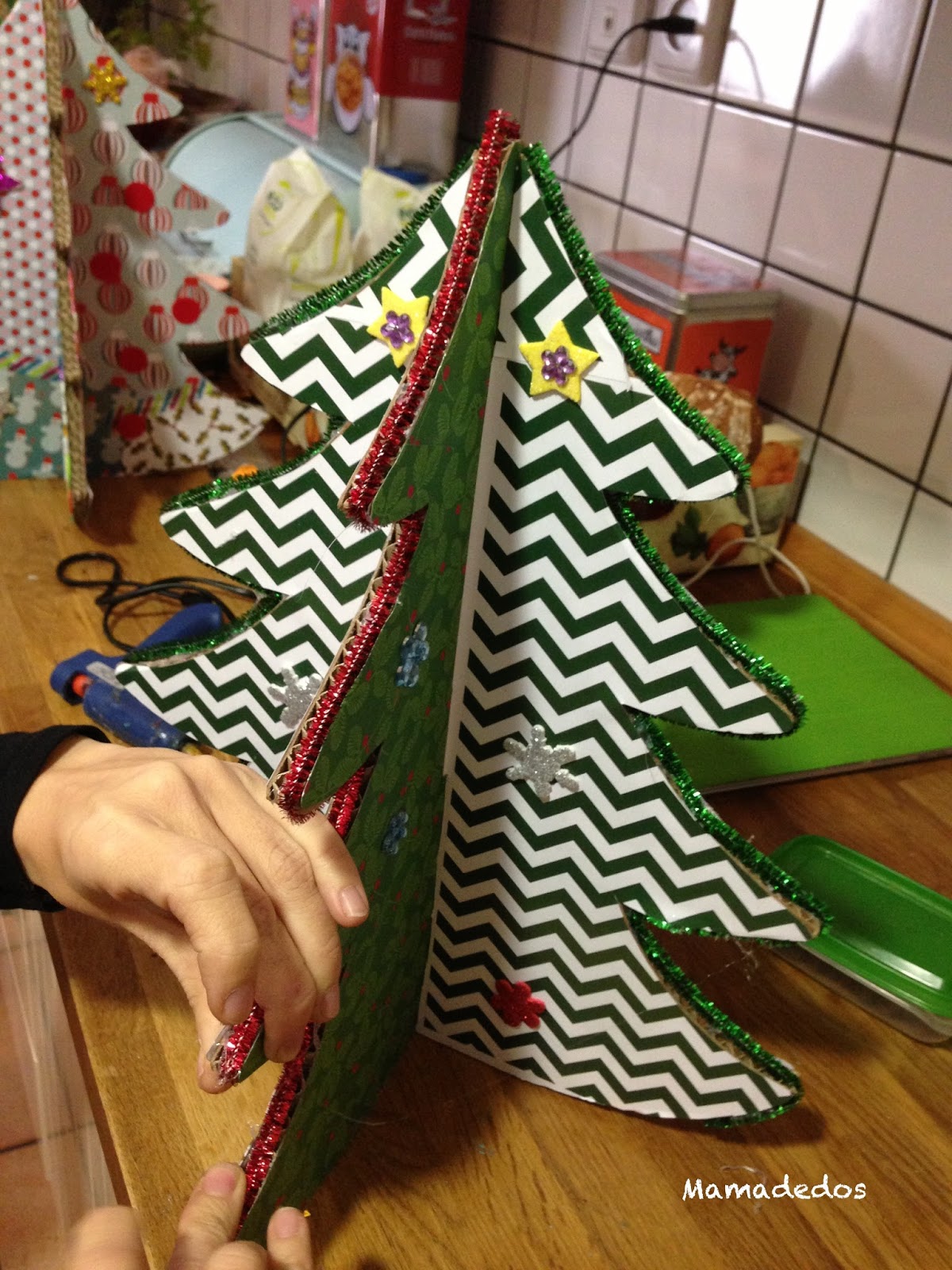 Finalmente el Taller de Arboles de Navidad se llevó a cabo en casa de Sandra; todo perfectamente organizado, pensado y preparado cuando llegamos a las 11 de la mañana... objetivo decorar nuestro árbol de navidad dando rienda suelta a nuestra creatividad.Una mesa repleta de pegamentos, lápices, tijeras, papeles de colores, purpurinas, washi tape (que vicio), estrellitas, bolitas de fieltro, "gomets".... la cosa prometía la verdad..... y nuestro árbol de cartón reciclado de cartóncartón.